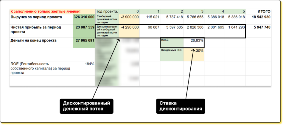 После этого финмодель автоматически продисконтирует денежные потоки — приведет стоимость будущих денег к стоимости денег в настоящий момент. Вот как это выглядит ↓
