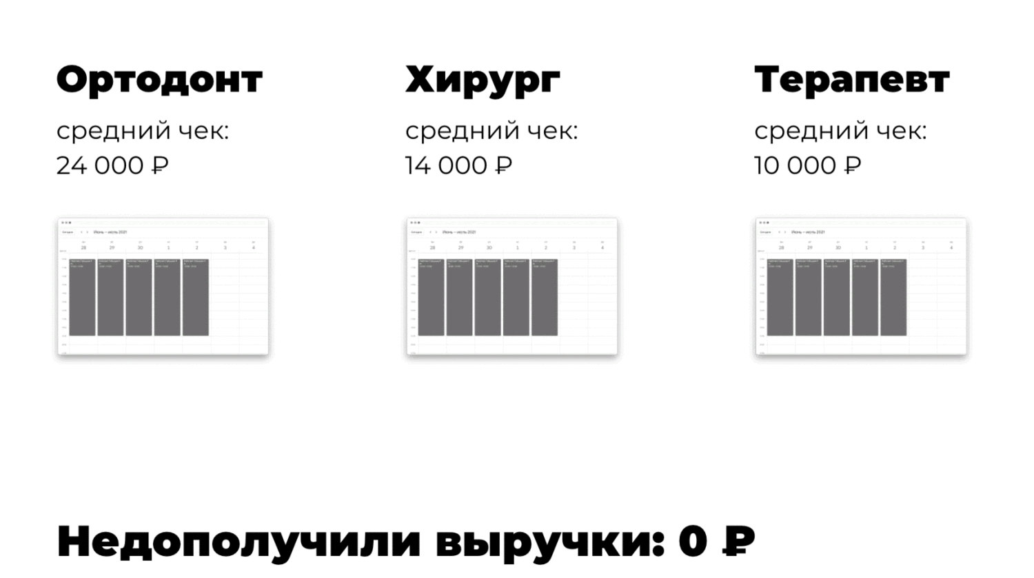 Еще у каждого врача своя специализация и средний чек. Например, у парадонтолога — 7000 рублей, у ортодонта — 24 000. Представьте, что в недельный отпуск ушел парадонтолог. За день он принимал четырех пациентов:
