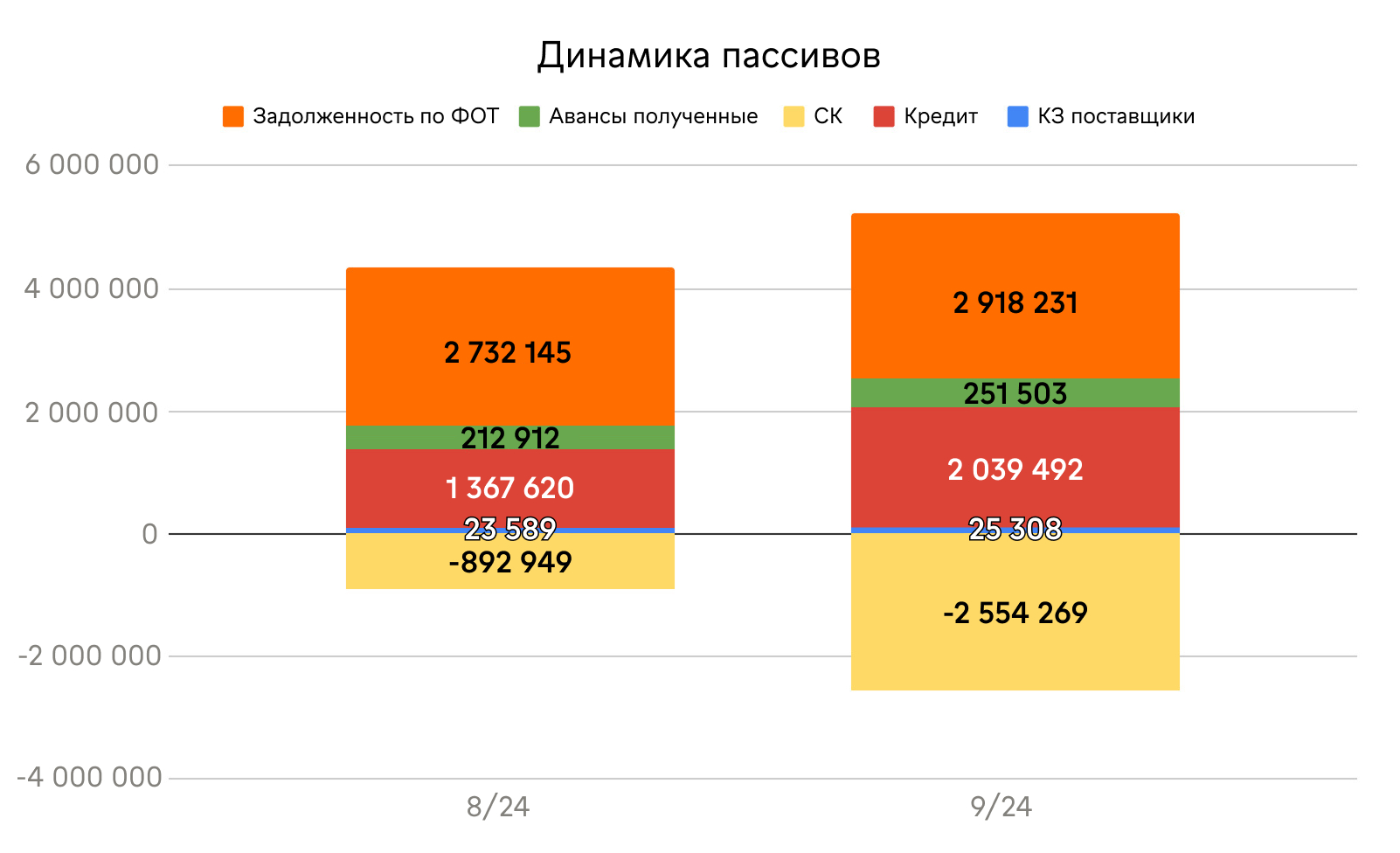 На графике «Динамика пассивов» видно, что резкий рост убытка с — 892 тыс. до — 2,55 млн ₽ стал тревожным сигналом системного кризиса. Такой провал типичен для компаний, где накопленные проблемы совпали с сезонным спадом. Достигнутая отметка в — 2,55 млн ₽ — критический порог, за которым начинается зона банкротства ↓