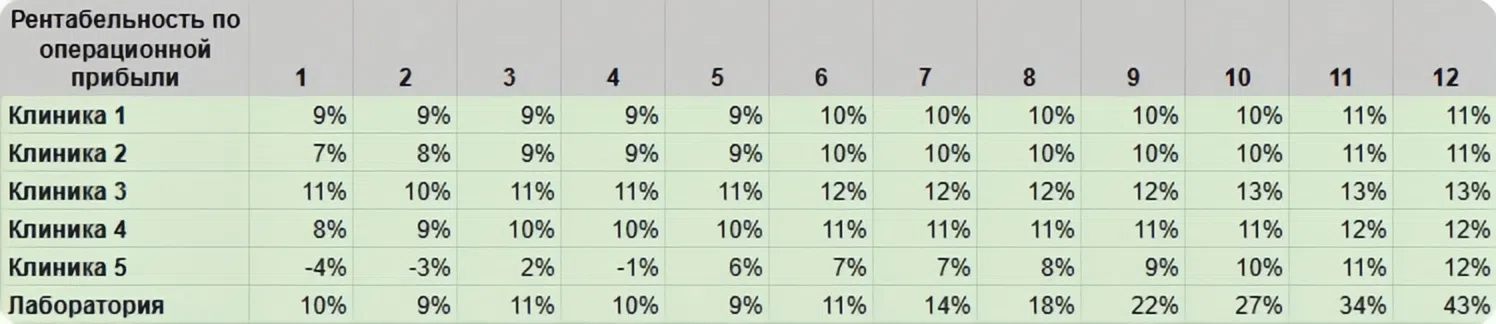 Какая прибыль или убыток у каждой клиники (выявили, что клиники 1-4 работают с маржинальностью по чистой прибыли от 7% до 13%).