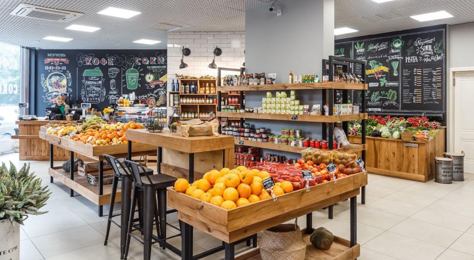 Все магазины оформлены в фермерском стиле с хипстерским уклоном: деревянные витрины, мешковина, открытая выкладка ↓