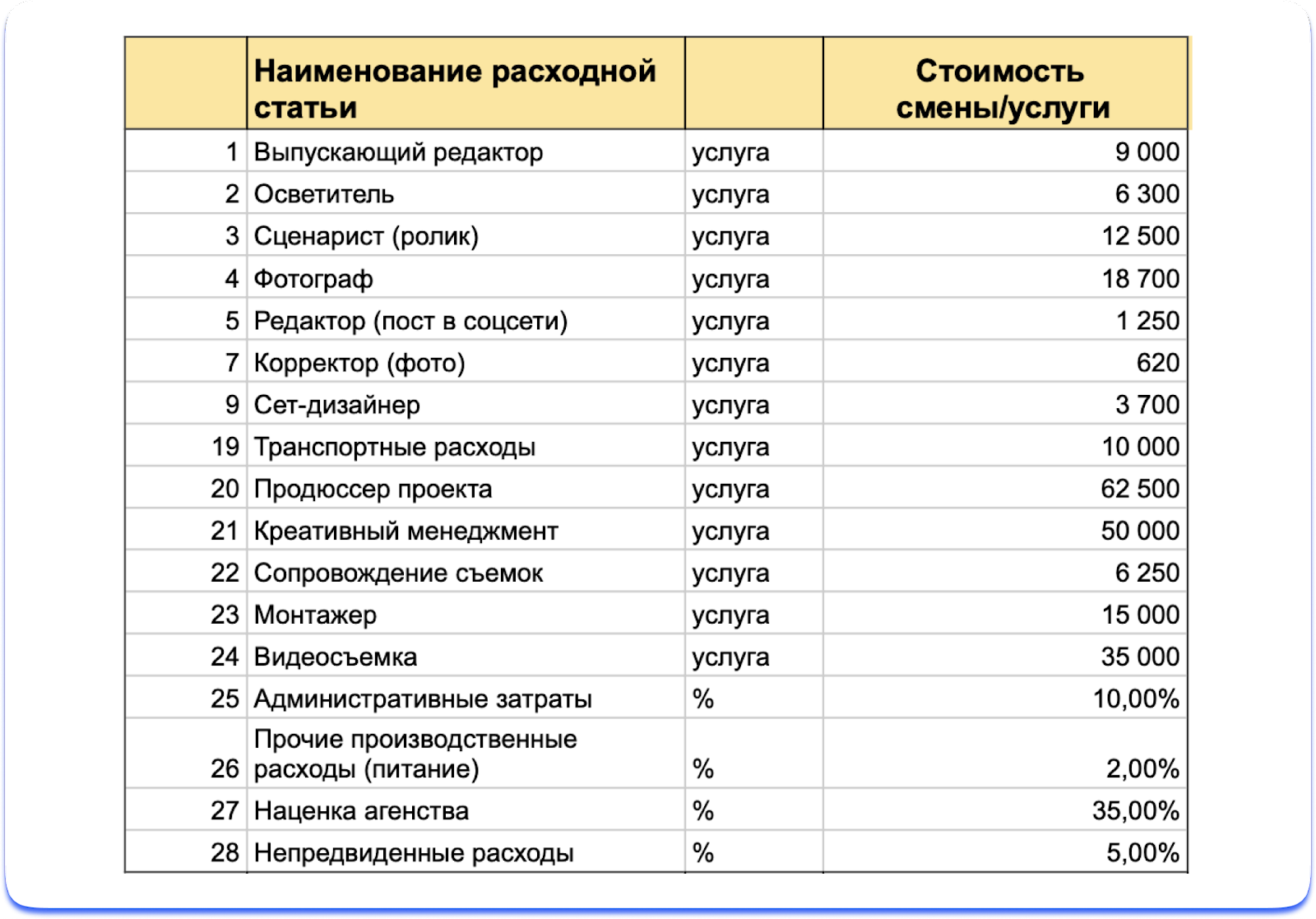 Чтобы рассчитать минимальную цену за такой проект, агентство узнает, что хочет заказчик, а затем отмечает в таблице, какие услуги понадобятся. Получается смета проекта, где агентство видит все свои затраты и прибыль ↓
