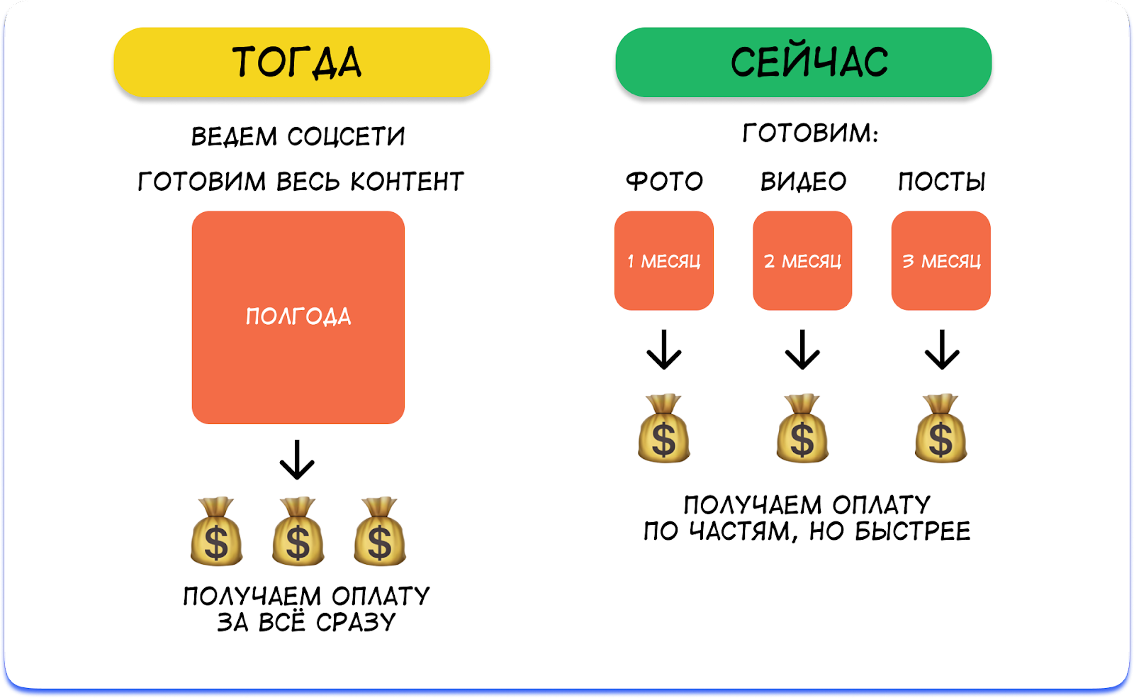 Клиент при этом может заказать работы только по одному этапу — теперь это самостоятельные продукты. Например, получить от «Звездочки» контент-план и работать по нему самостоятельно; забрать черновики и наработки по контенту, а дальше доделать их силами своих сотрудников.