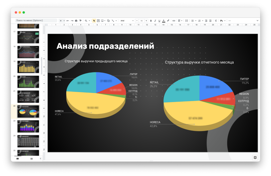 Кроме отчетов мы собираем теперь презентацию с наглядными графиками и схемами. Для их представления раз в месяц организуем встречу на 2 часа — за это время успеваем пройтись по всем важным показателям и оценить динамику во всех подразделениях и в бизнесе в целом.