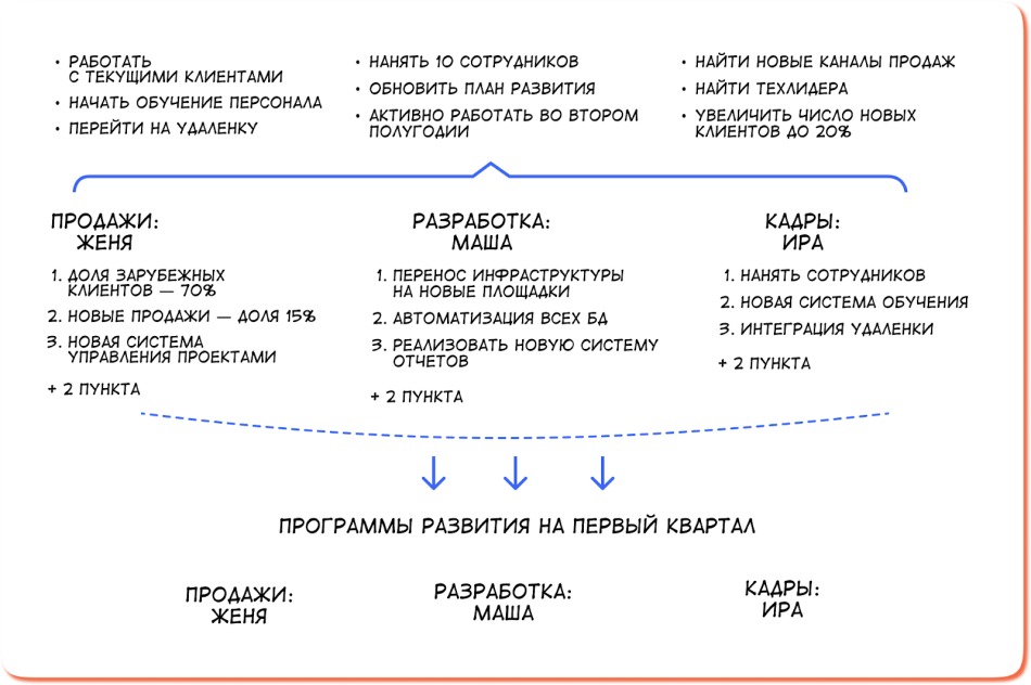 Из общих задач каждый руководитель отдела получил по пять ключевых и назначил ответственных. А затем из ключевых выделили планы развития по отделам на первый квартал.