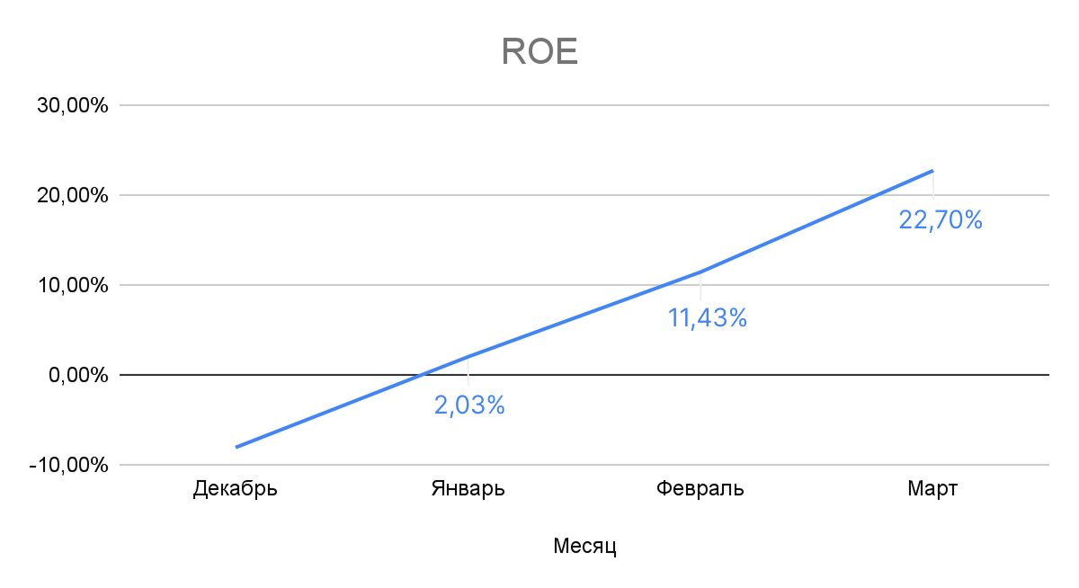 Итоговый ROE взлетел с 0% (декабрь 2024) до 24% (март 2025).