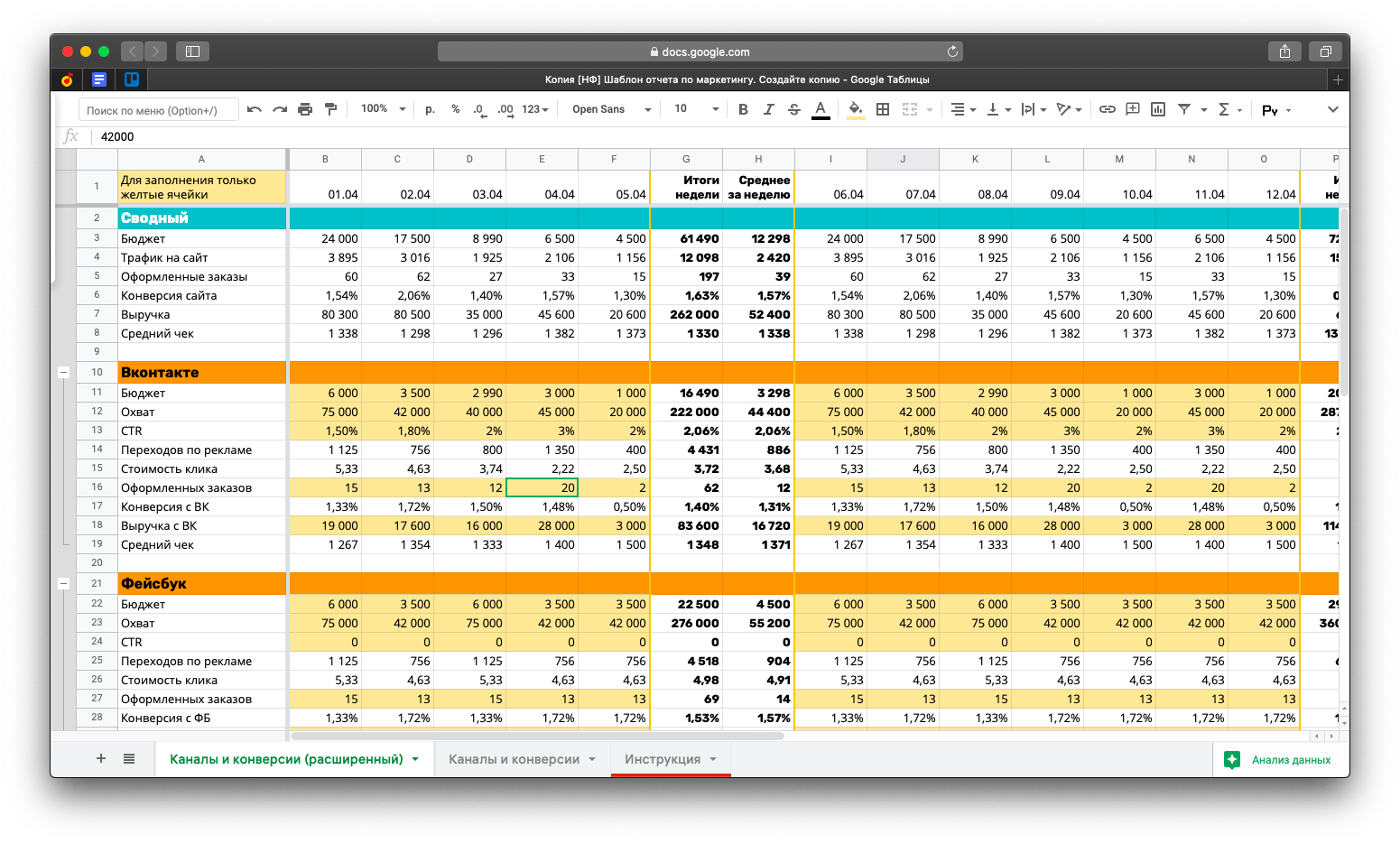 Сводный документ, в котором учитываются рекламные активности на разных онлайн площадках и привлеченный с них трафик. С помощью такого инструмента можно собрать данные для анализа эффективности рекламы из разных источников: в отчете отдела маркетинга наглядно видно, что эффективней для продвижения вашего продукта ― контекстная реклама в Яндекс.Директе или таргетированная во ВКонтакте. Также здесь можно вести учет рекламных расходов и выручки, которая получена от клиентов из онлайна.