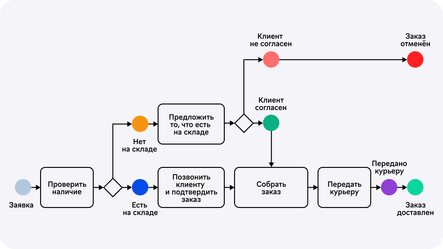 - Процесс — повторяющаяся последовательность действий, направленная на достижение цели. В процессе у участников нет задач, но есть функции. Например, функция кладовщика — это постоянная актуализация данных о товарах на складе и их формирование в заказы.