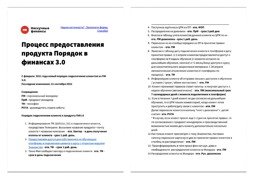 Шаг 2. Задокументировать процесс. Неописанный процесс = отсутствие процесса. Создайте к нему инструкцию, регламент, способы оценки качества. Если у сотрудников появляются новые функции — добавьте их в должностные инструкции.