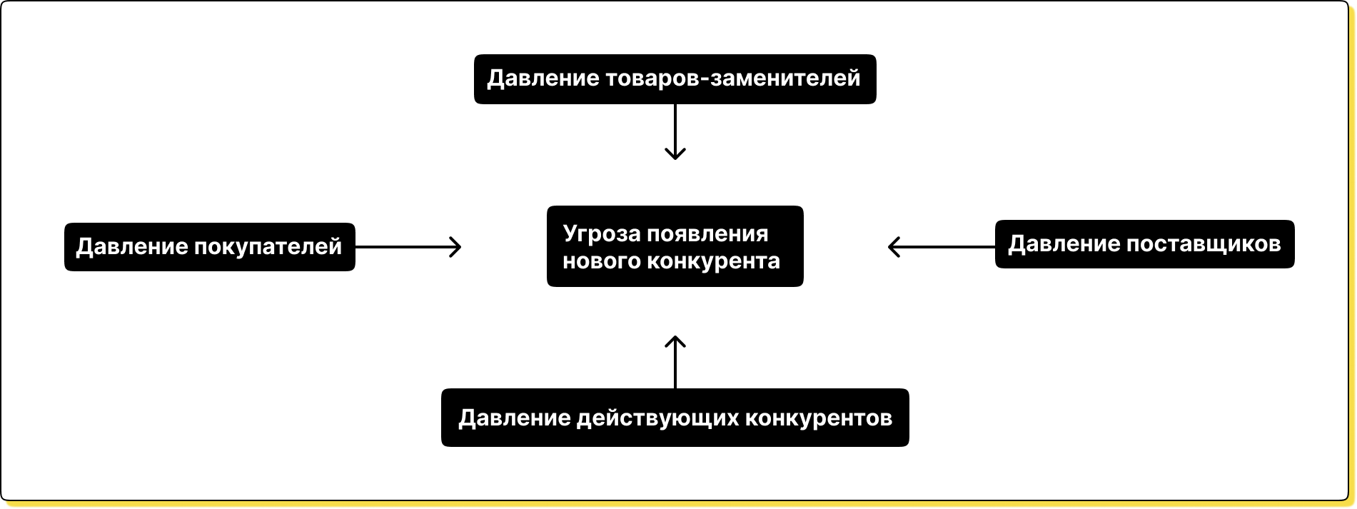 Угроза появления новых конкурентов. У бизнеса могут появиться соперники, которые предложат клиентам то, что не смогли дать другие участники рынка. Например, новые технологии, улучшенный сервис и низкие цены. Всё это снижает конкурентоспособность бизнеса, которому приходится вкладываться в модернизацию производства и продаж, тем самым снижая прибыль.