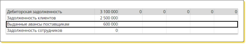 Если компания выдает аванс — это актив. Например, если бизнес выдает поставщикам аванс за отгрузку товара, сумму аванса фиксируют в оборотных активах по статье «Выданные авансы» в разделе «Дебиторская задолженность».