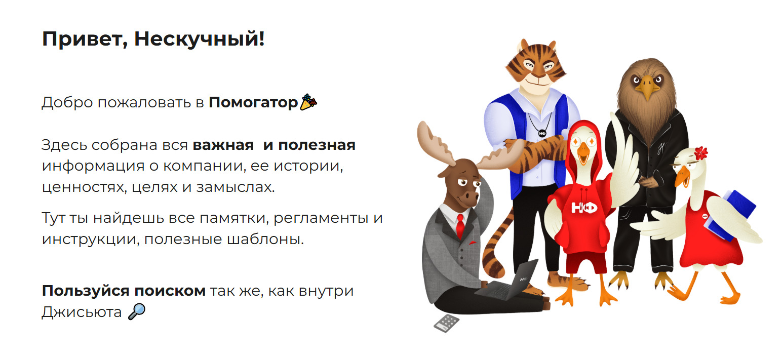 Мы в Нескучных уже давно освоили этот формат. Портал «Помогатор» — универсальная дорожная карта для новичков. Здесь есть всё, от принципов работы и контактов сотрудников до анонсов событий.