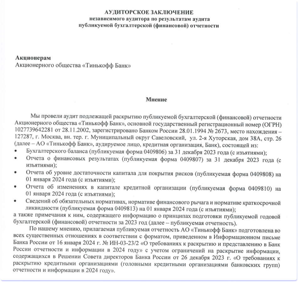 Аудиторское заключение для АО «Тинькофф банк» за 2023 год