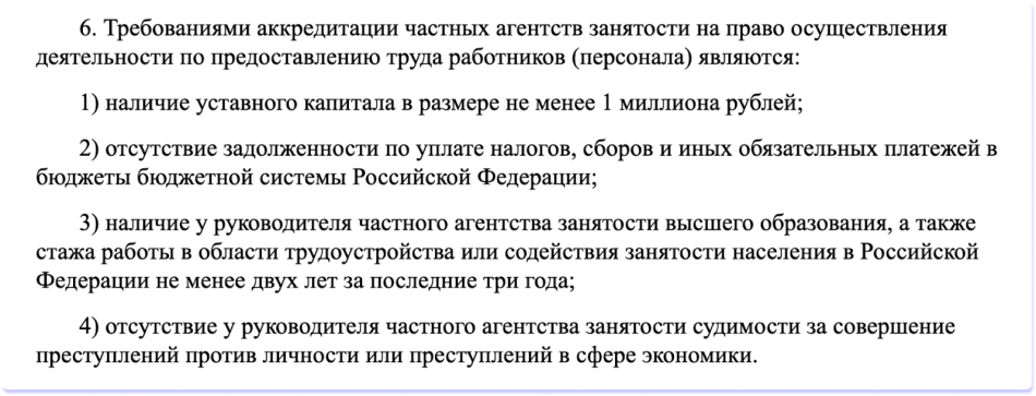 Следовательно, просто так ни одна компания предоставлять сотрудников другой компании не может. Чтобы заниматься аутстаффингом, нужна аккредитация, а для ее получения нужно соответствовать определенным требованиям.