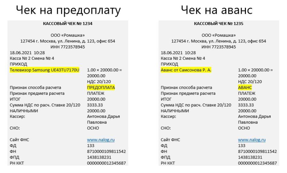 Когда пробивается авансовый чек, в нём не указывается сам товар, а просто пишется «платёж». Способ расчёта будет указан как «аванс». Также в чеке нужно указать «аванс от ФИО» или название компании. Таким образом фиксируется, что деньги поступили от кого-то в качестве предоплаты.