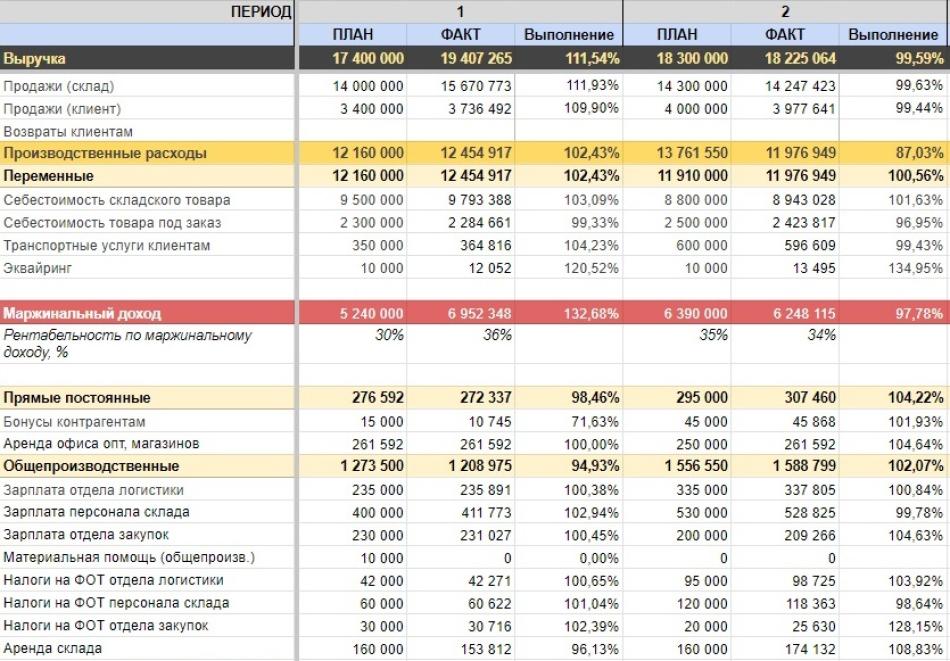 Чтобы понимать, получается ли следовать плану и какие факторы на это влияют, предприятию нужно каждый месяц вписывать в БДР факт — сколько расходов и доходов было в реальности. А затем сравнивать его с планом: какой процент выполнения? почему так?