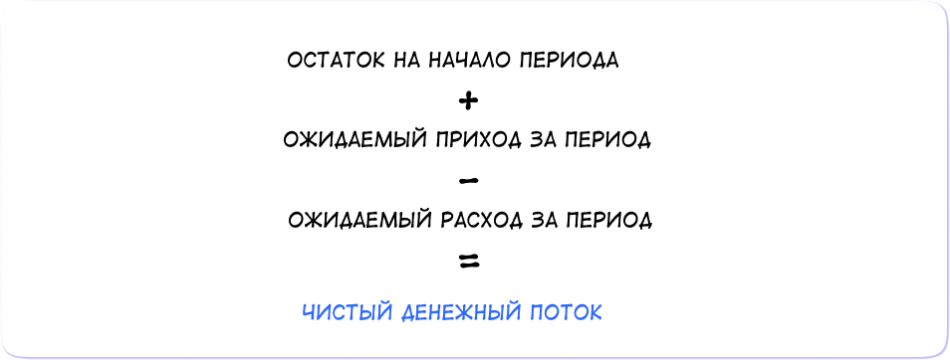 Шаг 4. Рассчитать чистый денежный поток. Для этого нужно сложить остаток на начало периода и планируемый доход. А затем вычесть расходы.