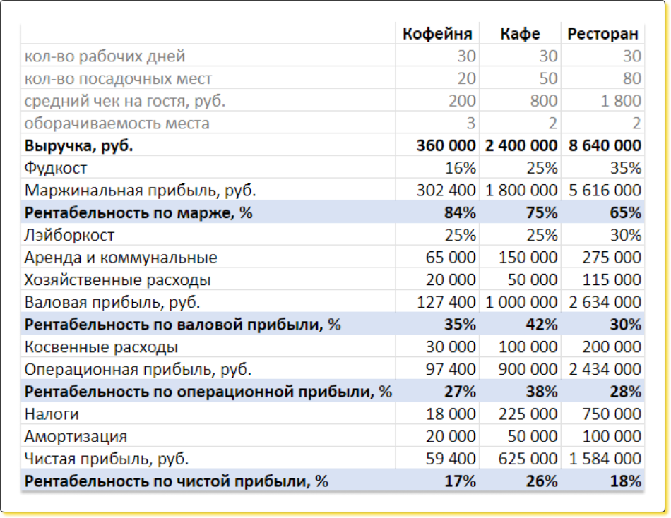 Если у вас рентабельность сильно ниже — что ж, стоит задуматься. И как минимум проанализировать ОПиУ, чтобы понять, в каких статьях расходов искать проблемы. Вот как может различаться рентабельность кофейни, кафе и ресторана в ОПиУ ↓