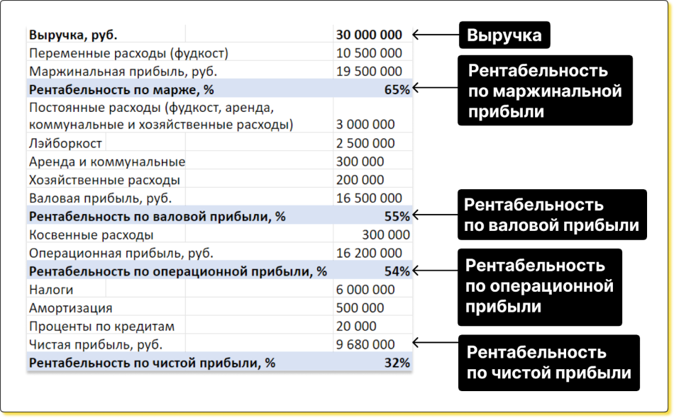 Общепиту стоит считать рентабельность по чистой прибыли, чтобы учитывать все статьи расходов и их влияние на прибыль.