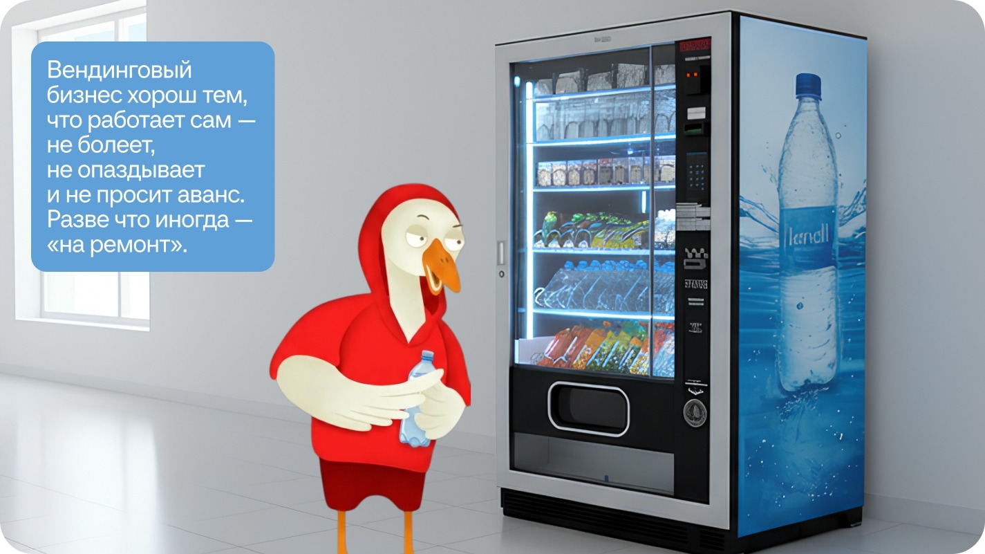 Вендинг — это продажа товаров без продавца через автоматы. Формат позволяет работать без сотрудников и круглосуточно.
