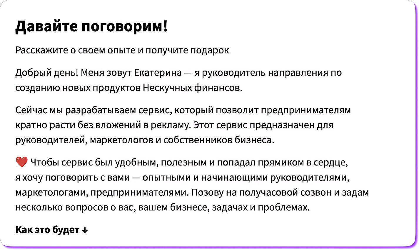 1. Контекст. Что изучали и зачем: «Мы провели 10 интервью с клиентами, чтобы понять, какую реальную задачу они решают, покупая наш продукт».