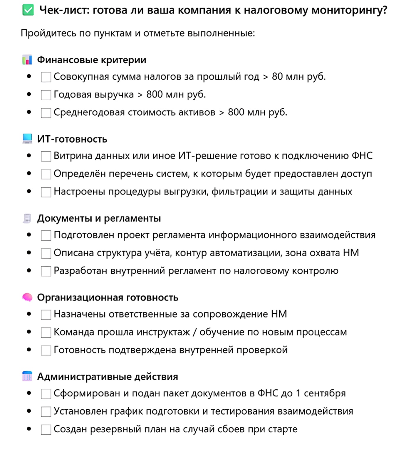 Чтобы перейти на мониторинг, компания должна соответствовать трём финансовым критериям: от 80 млн рублей налогов, 800 млн рублей выручки и активов. Также важно обеспечить техническую готовность: доступ к ИТ‑системам, СУНТК, регламент взаимодействия.