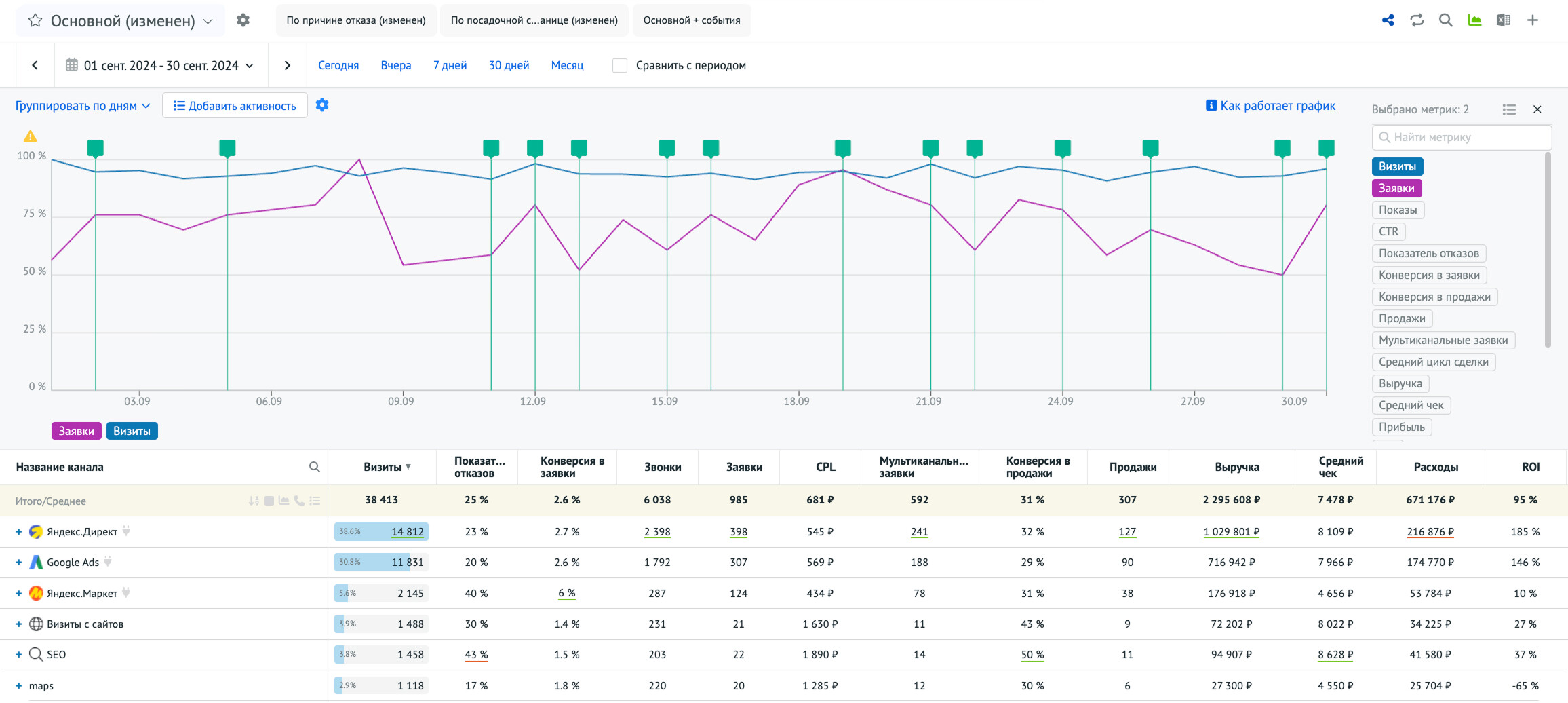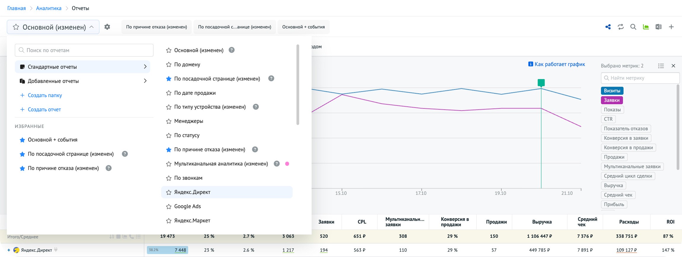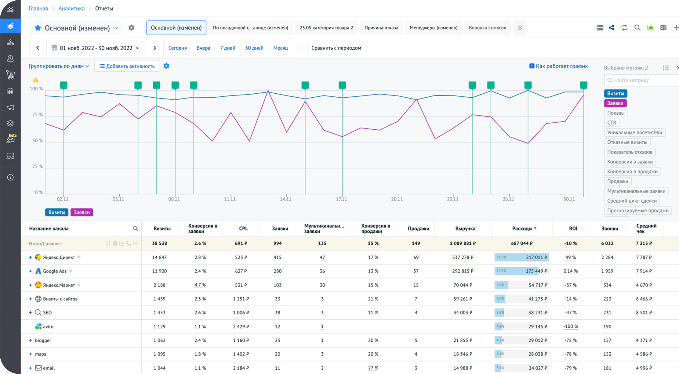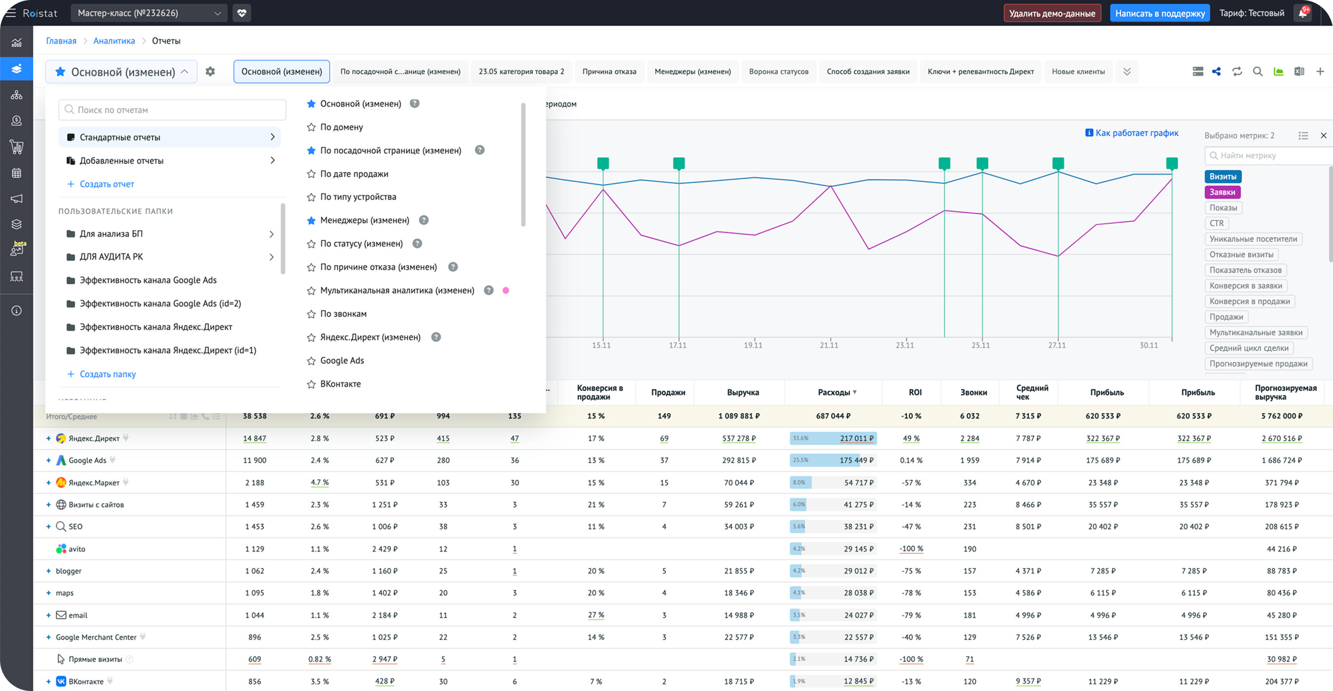 Здесь отображены показатели: визиты, расходы, конверсии, выручка и ROI и другие: