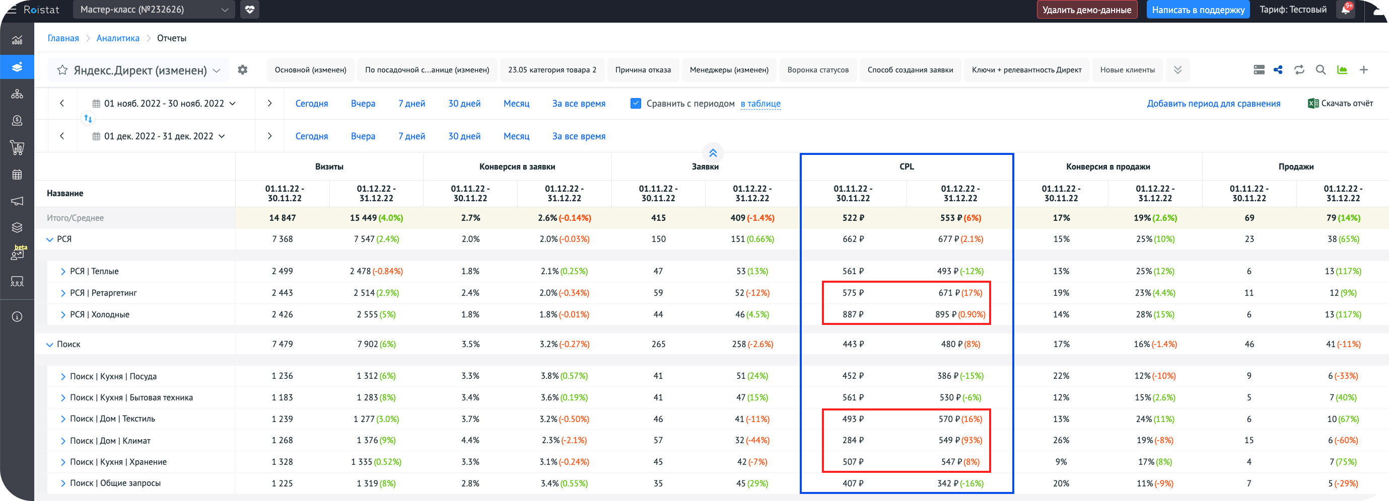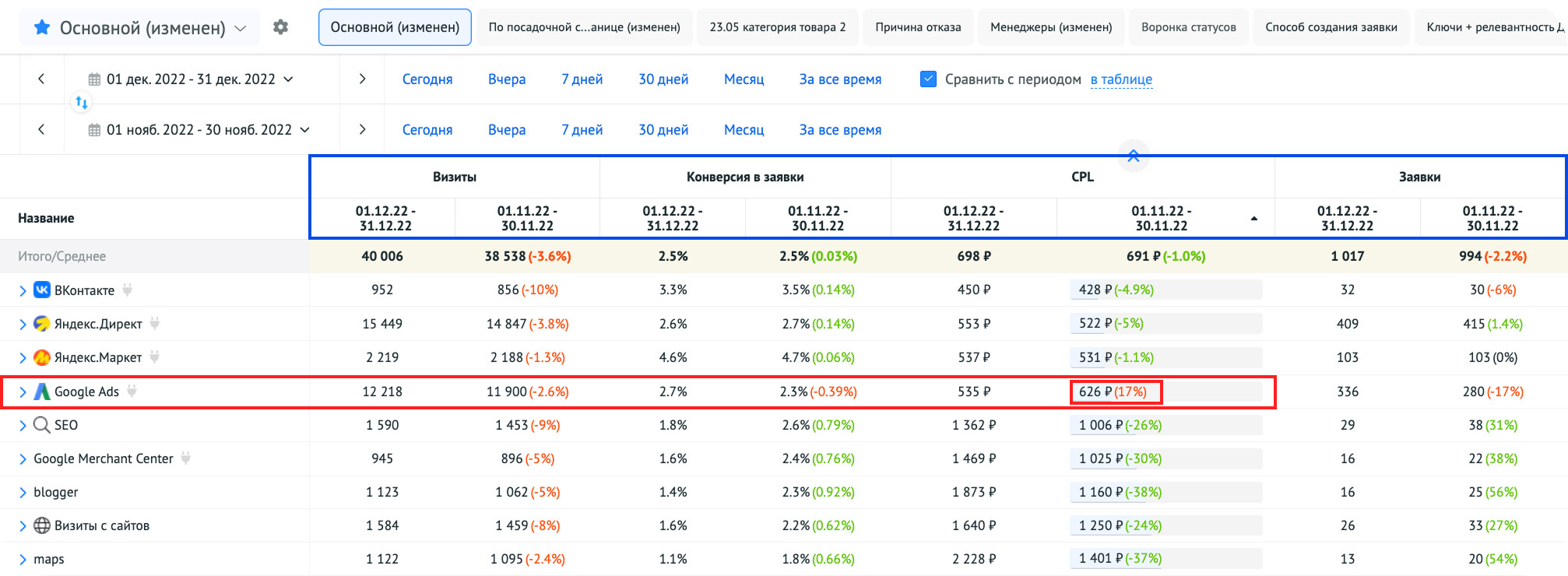 Затем нажмите на кнопку «Сравнить с периодом» и начать. Для примера будем сравнивать с CPL. Вот что получится: