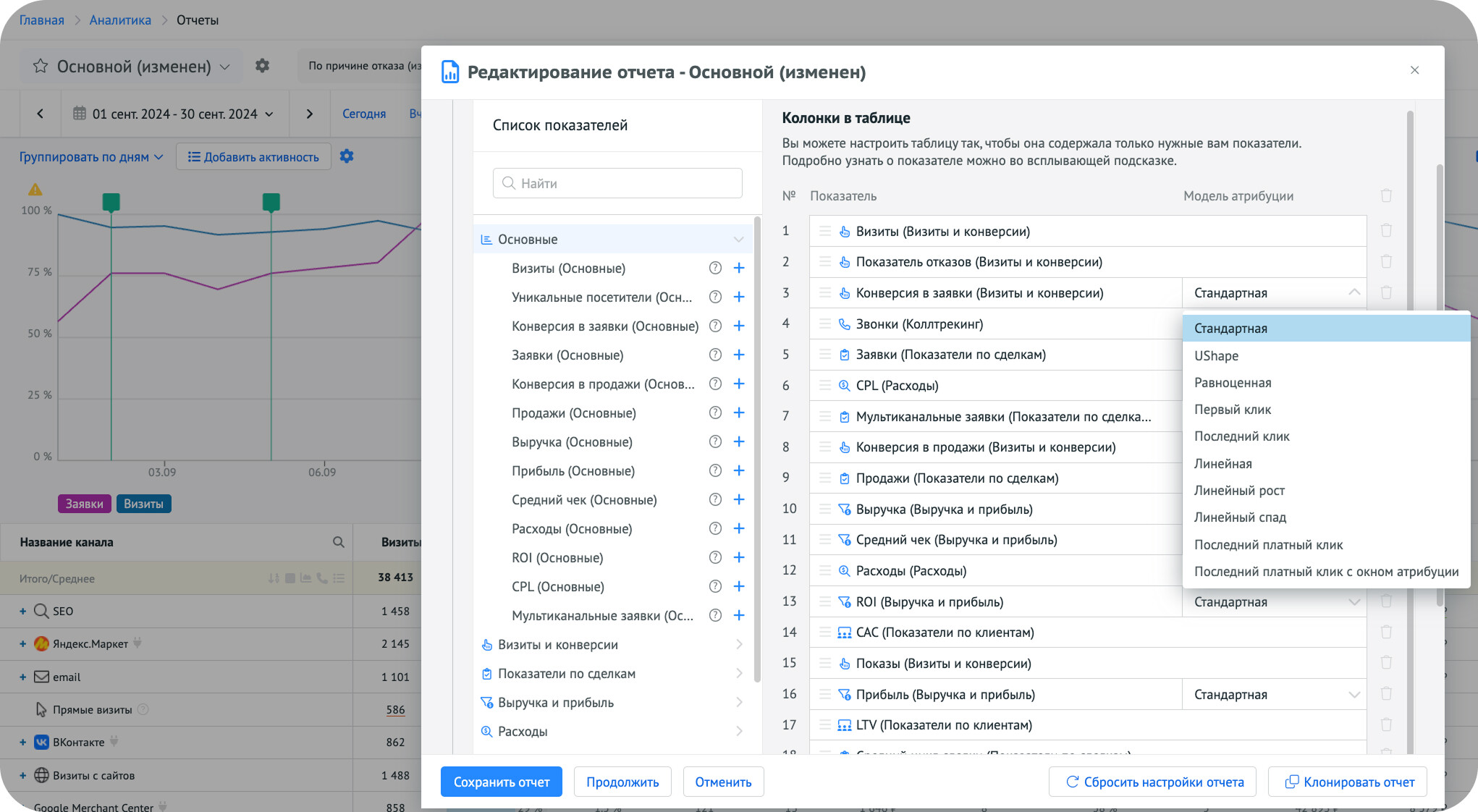 Интерфейс настройки отчёта: выбор метрик (слева) и моделей атрибуции (справа), включая кастомные, для анализа вклада каналов