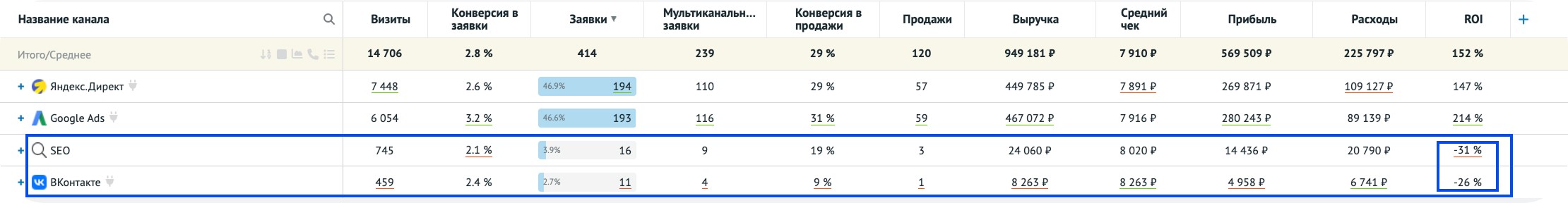 В Основном отчёте каналы ранжируются ROI. Обращайте внимание на каналы с отрицательным ROI. На нашем примере это ВКонтакте и SEO.