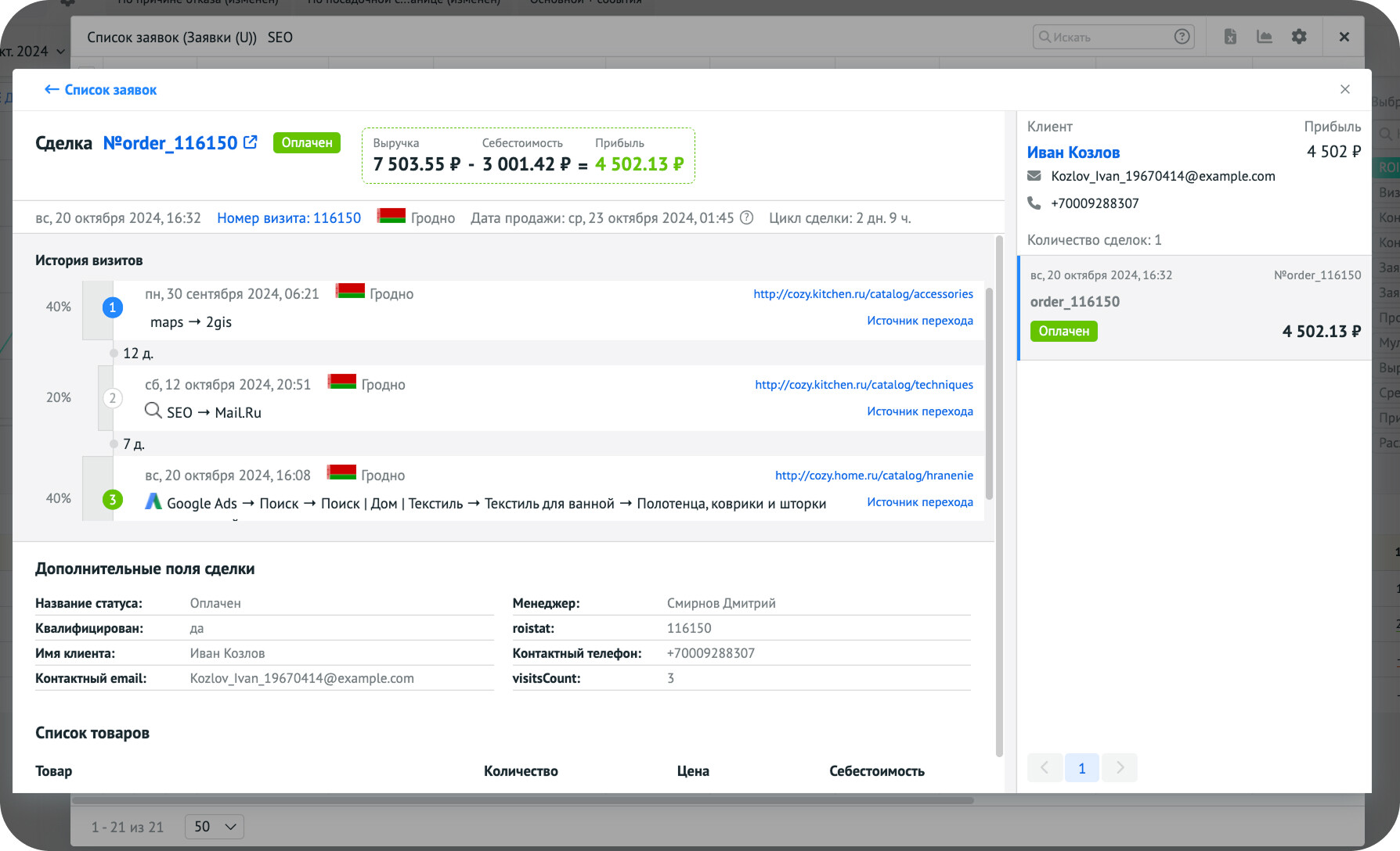 Когда клиент оставляет заявку на сайте, оснащенном счётчиком Roistat, данные о визите автоматически фиксируются и получают номер. Этот уникальный номер визита помогает отслеживать пользователя и связывать его с продажей.