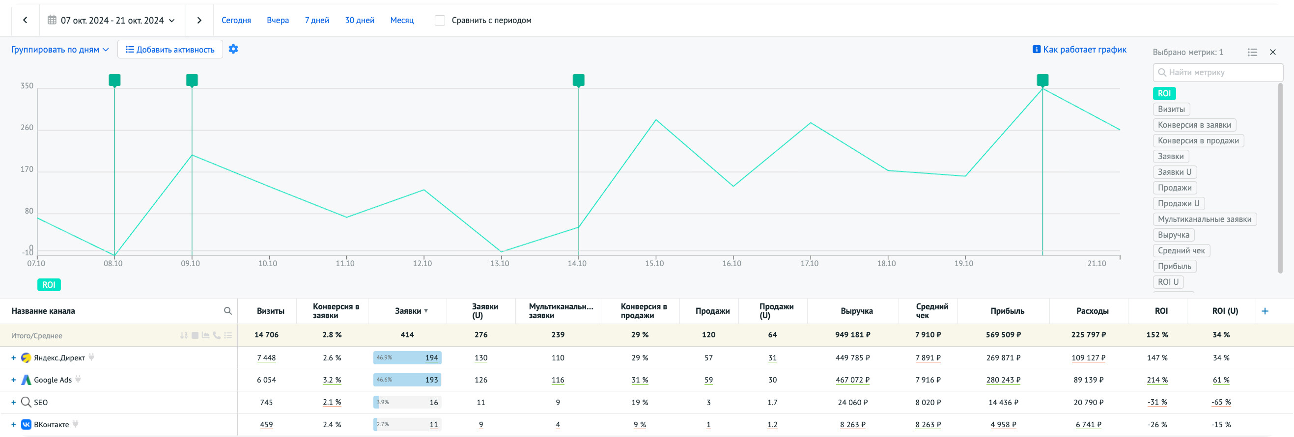 Теперь мы видим, что ВКонтакте и SEO регулярно участвуют в привлечении продаж и имеют положительный ROI. Выходит, отключать их не надо.