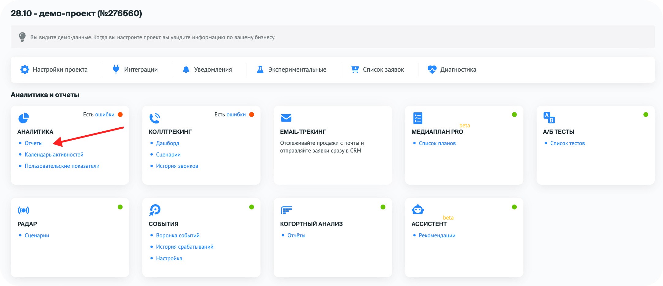 Шаг 1: начните с отчёта «Основной» и его простых показателей. Это первый и базовый отчёт, который открывается, когда завершена интеграция. Чтобы в него попасть, нужно на главной странице проекта, в блоке «Аналитика», выбрать пункт «Отчёты».
