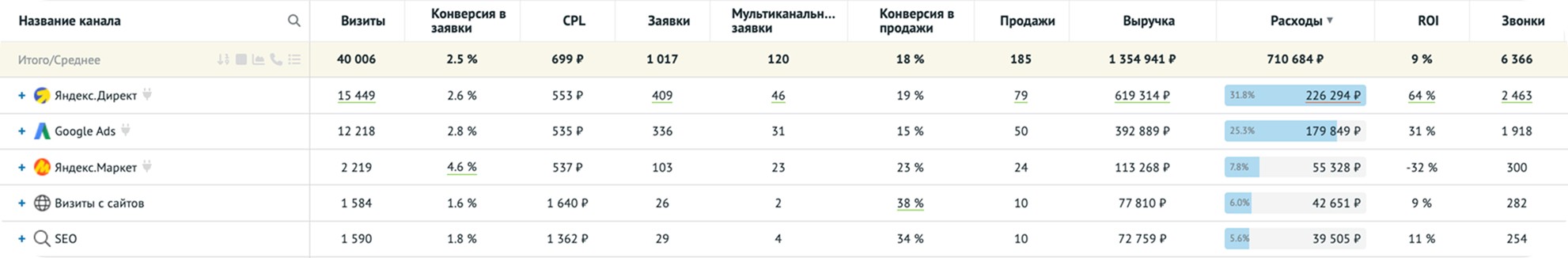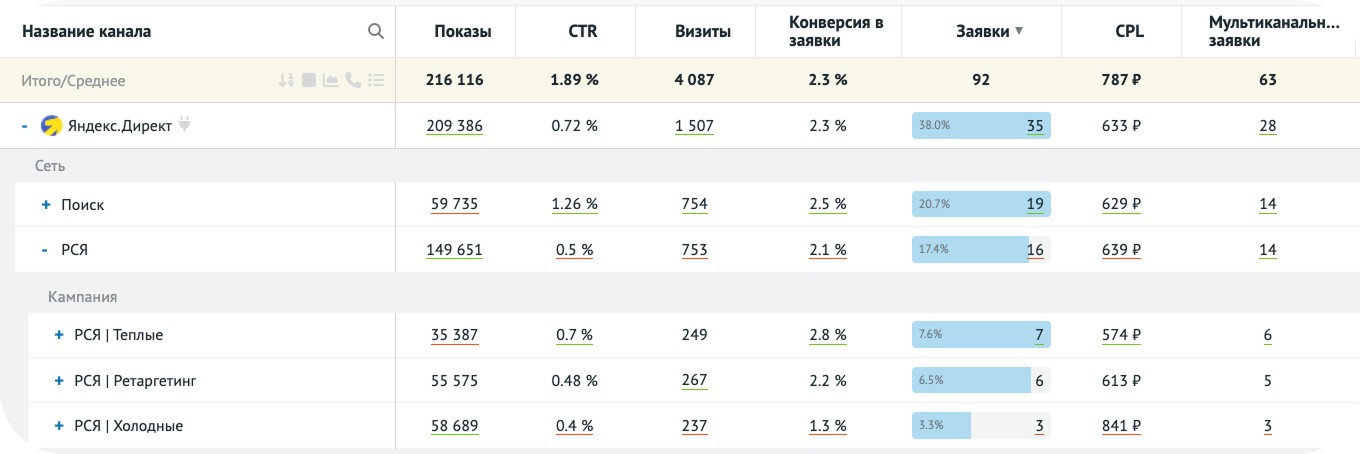 Одного основного отчёта достаточно, чтобы понять, какой канал нуждается в дополнительной проверке, а какой уже явно сигнализирует о своей неэффективности. Разберём на примерах.