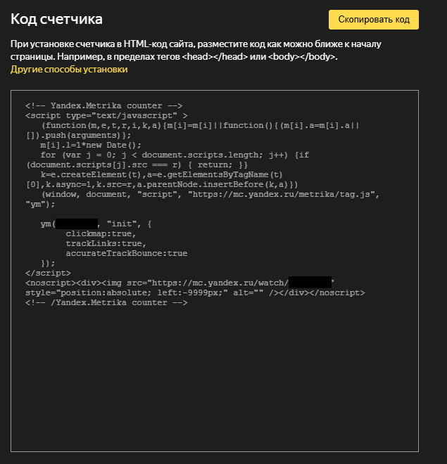 Получение кода. После создания счётчика скопируйте уникальный код из раздела «Код счётчика» (выглядит как ).