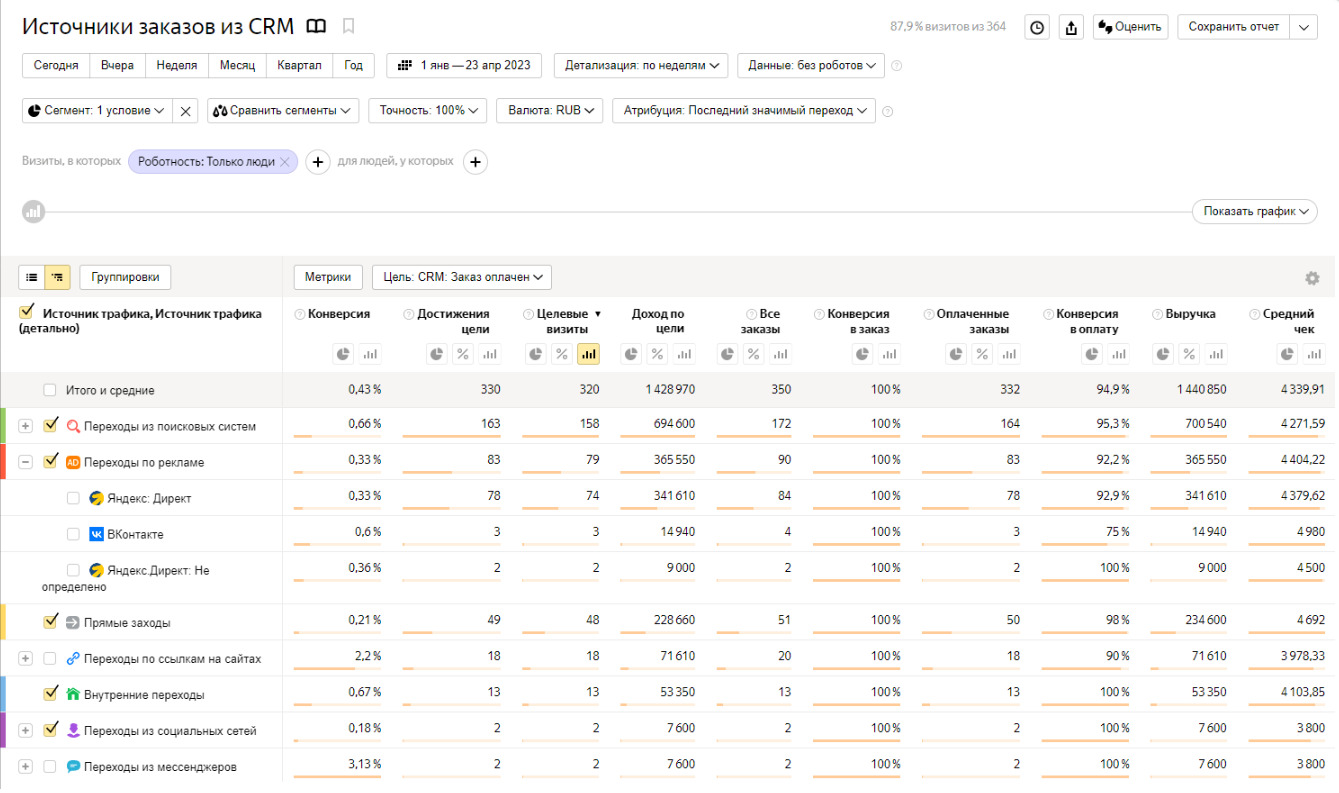 Анализировать взаимодействия с учетом звонков, форм и оплат через интеграцию с CallTracking и CRM.