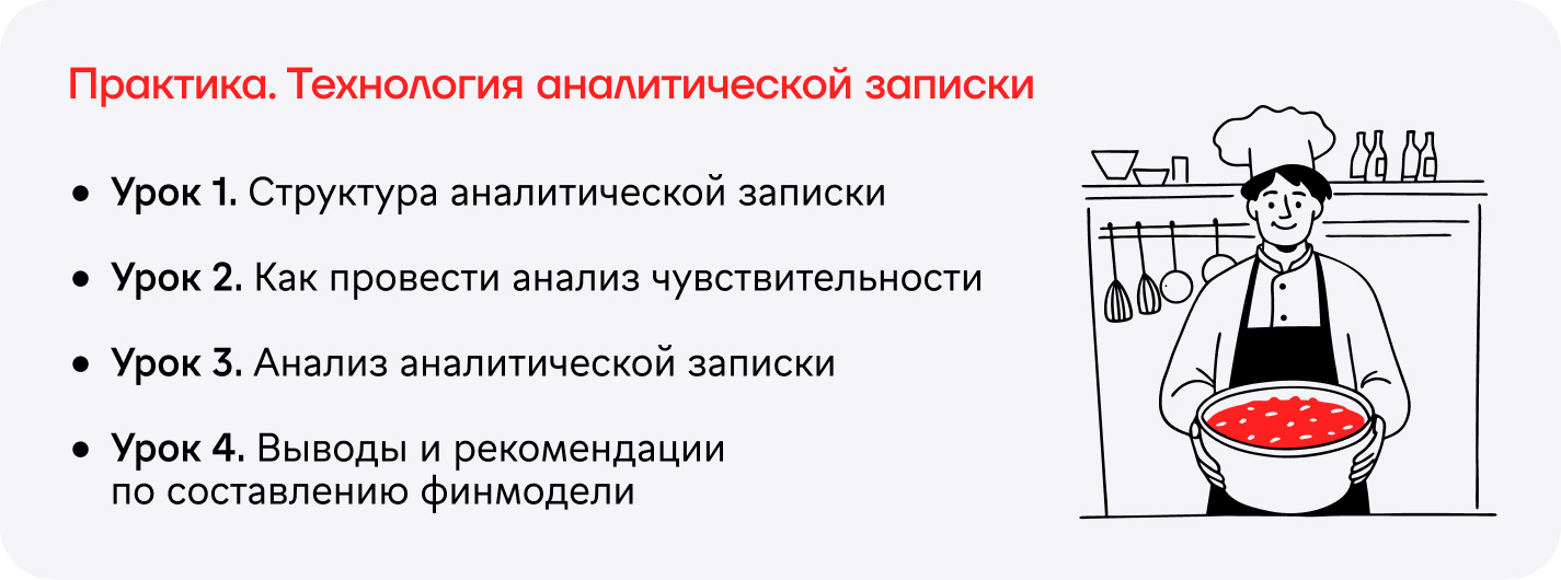 5 модуль — составление аналитической записки на основе финмодели. Вот, что нужно руководителям! Не цифры, а то, что можно из них создать — выводы, возможные решения, прогнозы.