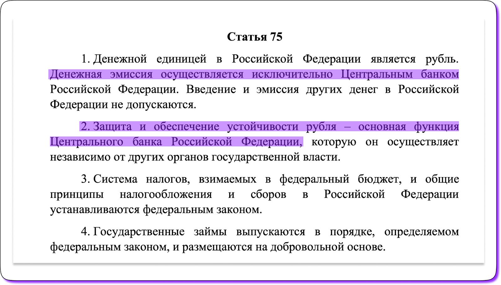 Центробанк в РФ — это Банк России. В отличие от Центробанков других стран, Банк России — мегарегулятор (это не преувеличение, а реальный термин). Как мегарегулятор он отвечает не только за выпуск денег, но еще и за эффективную работу всей финансовой системы России. А главная его функция — обеспечение устойчивости рубля — это прописано в Конституции: