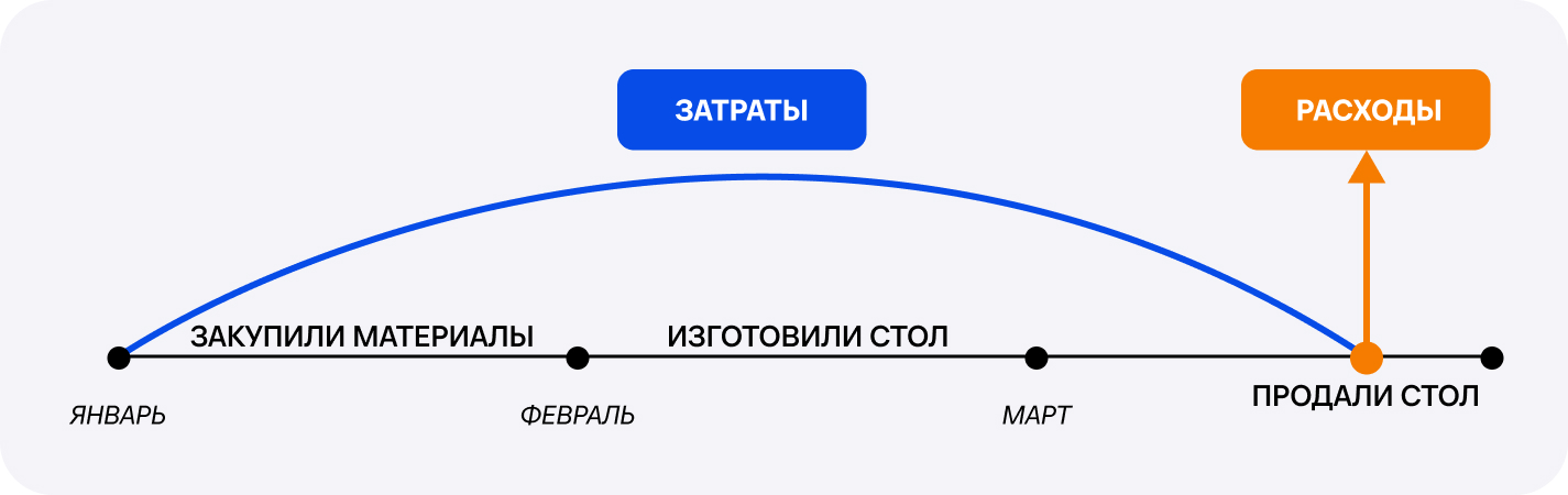 С учётом есть важный момент: расходы учитываются в том же периоде, что и доходы. Продали стол в марте, получили доход в марте, значит, и расходы на этот стол учитываем в марте, а не в феврале. Пока дохода нет, принятие расходов отсутствует, они остаются затратами, — так работает принцип соответствия.