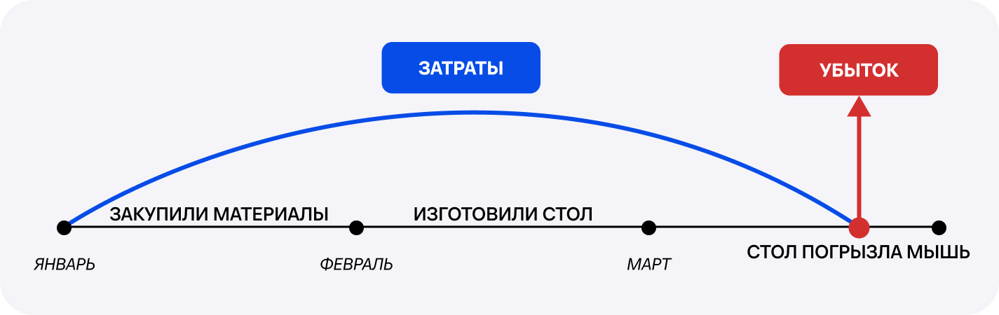 Ещё есть убытки — как помните, это третий путь затрат. Убытки, как и расходы, влияют на финансовый результат, но не зависят от времени, когда компания получила доход. На примере «Столешницы» — затраты станут убытками, когда обнаружится, что стол испорчен.