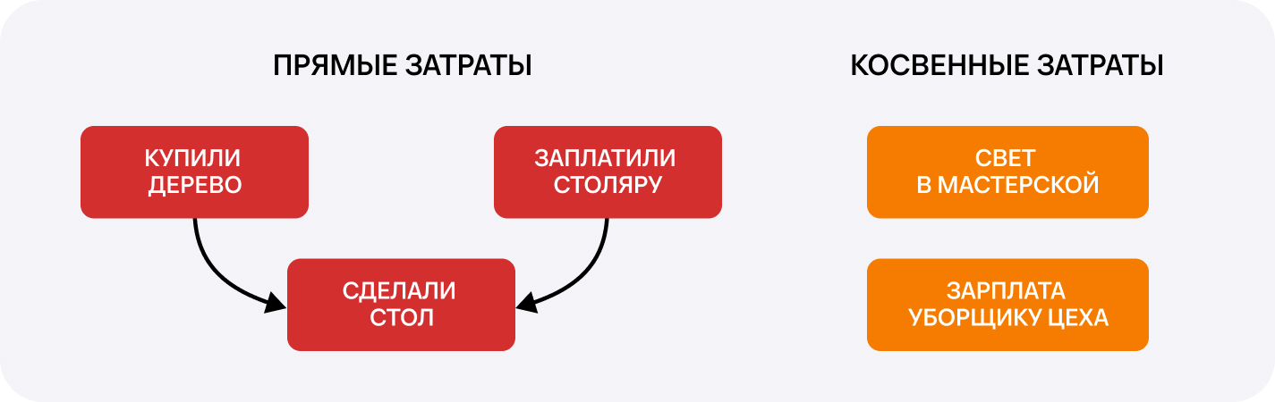 Косвенные — это затраты, связанные с производством, но те, что нельзя отнести к изготовлению стола. Например, освещение мастерской и зарплата персонала, который убирает цех.