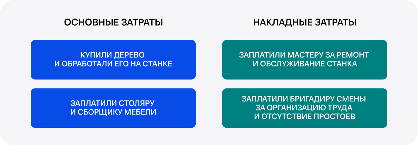 Основные затраты — всё, что связано с производством. Накладные — всё, что помогает наладить производство и управлять им.