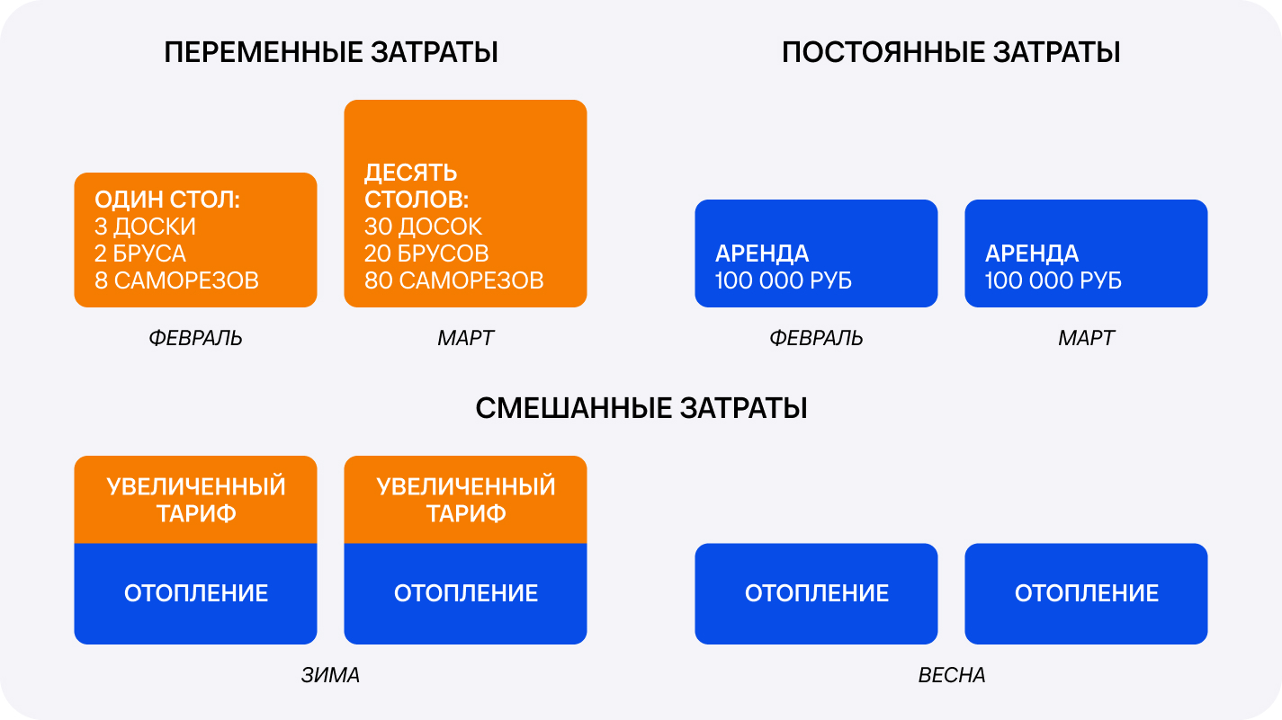 Если у компании в марте увеличились объёмы производства, то переменные затраты вырастут, а постоянные не изменятся. Смешанные затраты состоят из переменной и постоянной частей. Например, весной компания будет платить за отопление по стандартному тарифу, а зимой по увеличенному