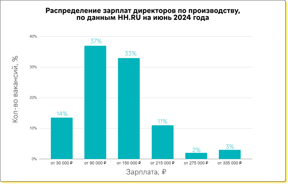 Минимальная зарплата — от 30 000 ₽, а максимальная — от 335 000 ₽. Но в вакансиях указывают зарплату «от», поэтому 335 000 ₽ — это еще не максимальная оплата работы директора по производству.