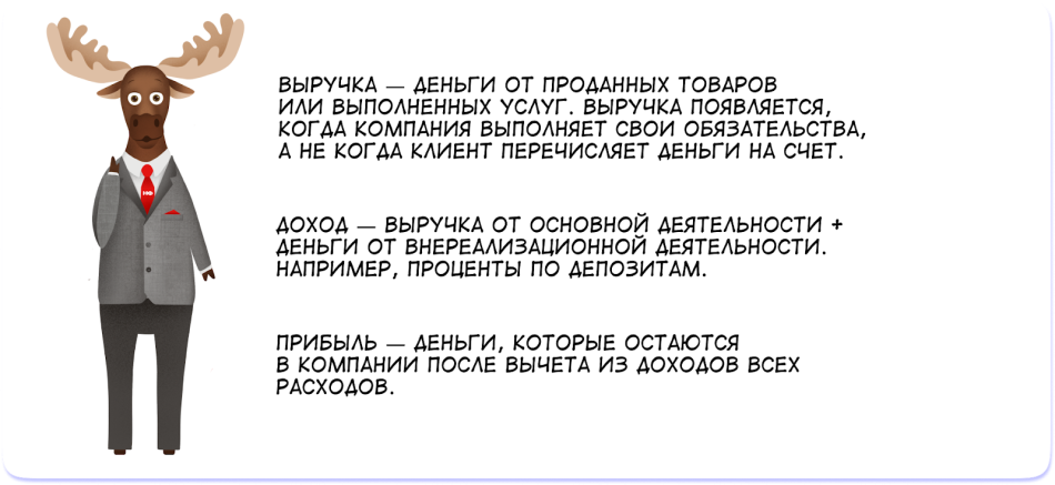 Доход — это выручка бизнеса, то есть деньги, которые компания заработала на своей деятельности, плюс кое-что еще. «Кое-что» — это деньги не от работы бизнеса, а, например, проценты по банковским депозитам или оплата от арендатора.