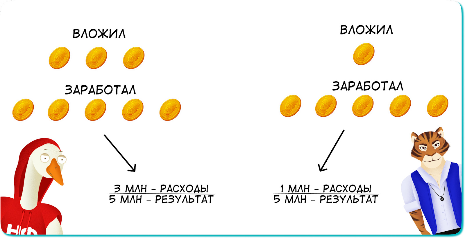 Например, есть два бизнеса — у гуся и тигра, оба занимаются строительством домов. Оба зарабатывают по 5 млн ₽ прибыли в месяц — это их результат. Вроде всё одинаково, но если посмотреть на затраты, станет ясно, что тигр работает эффективнее ↓