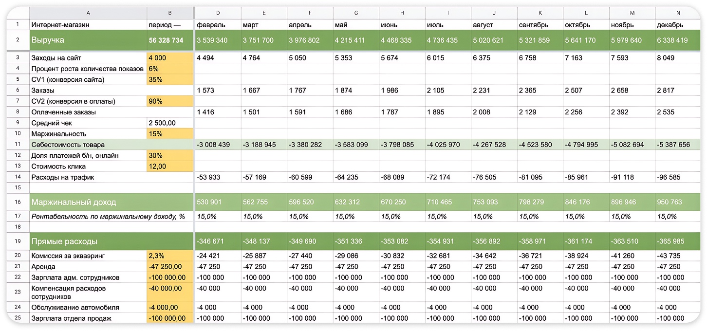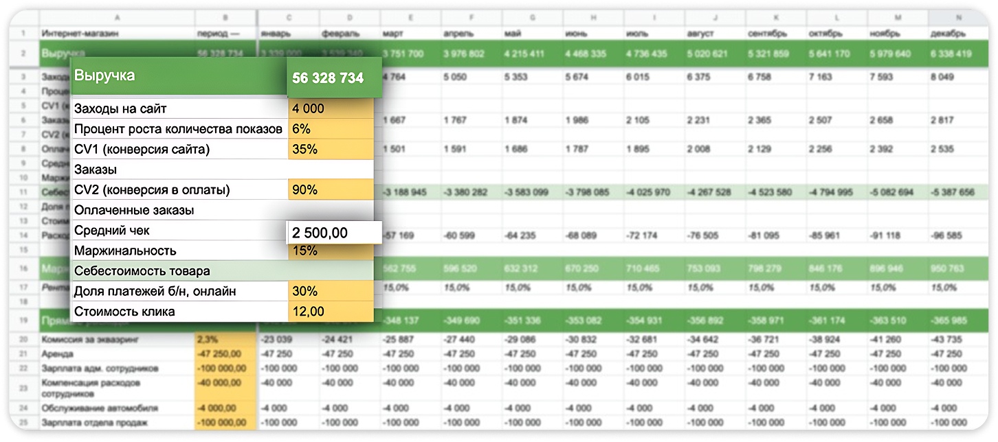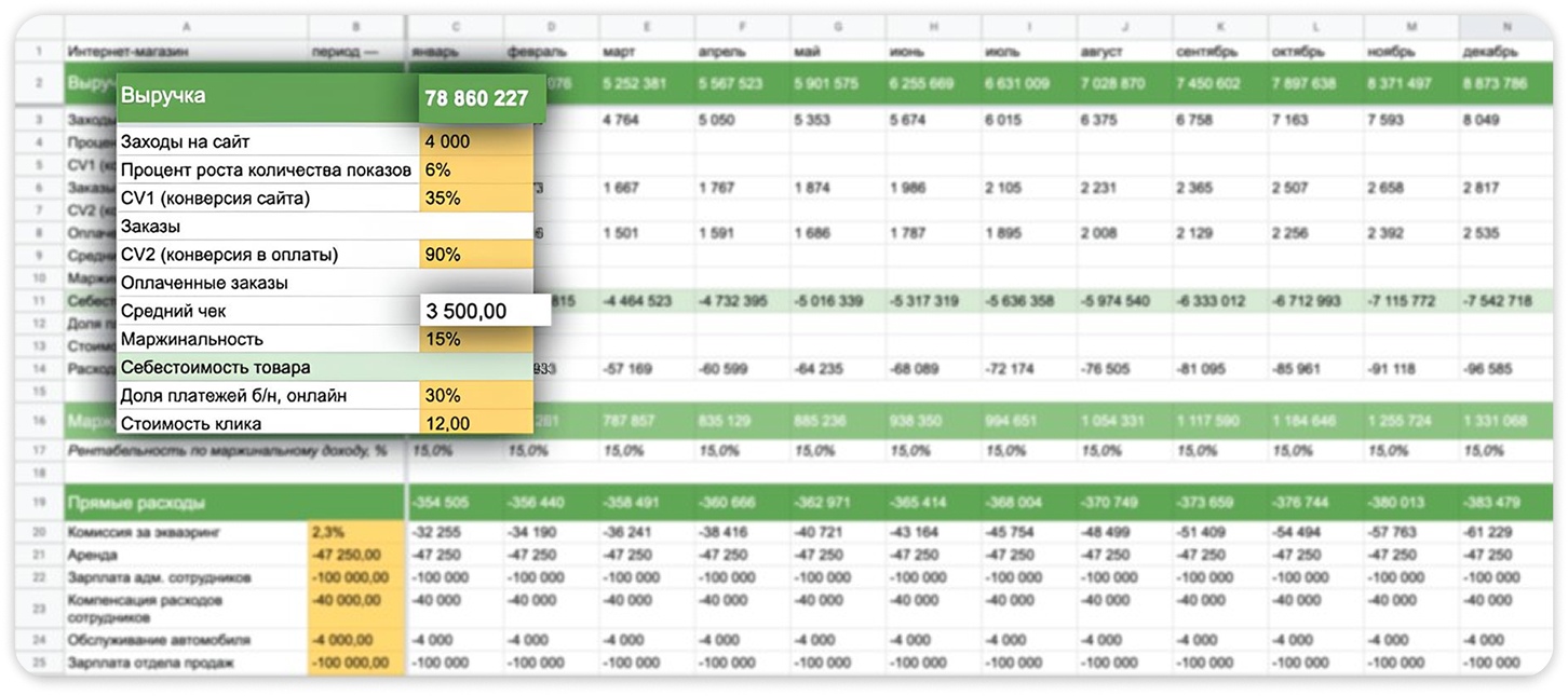 Финансовая модель — это табличка — оцифровка бизнеса. Там все ключевые показатели взаимосвязаны. Можно крутить-вертеть и смотреть, что от этого поменяется. Финансовая модель поможет наметить перед собой адекватную и достижимую цель, разработать различные сценарии развития бизнеса и определиться с самым оптимальным из них.