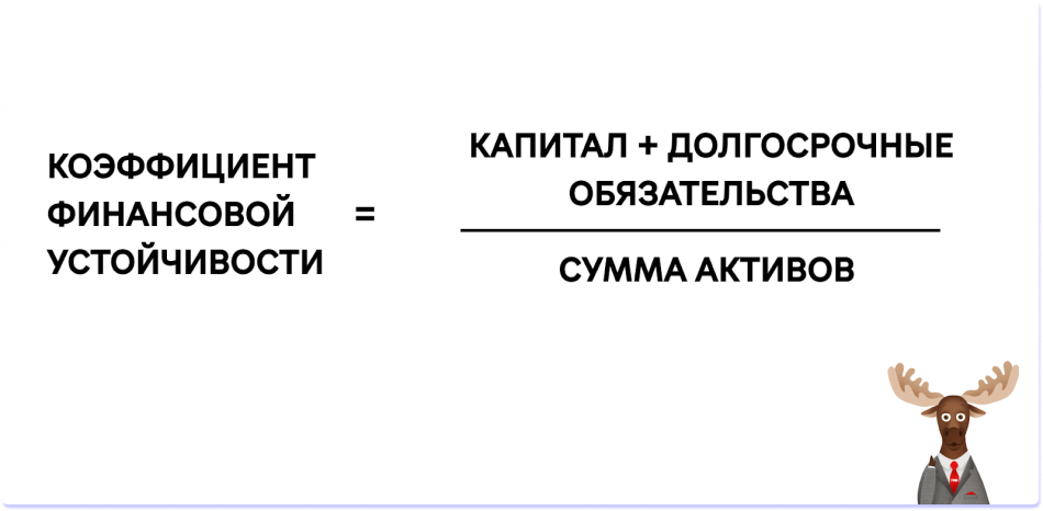 Коэффициент финансовой устойчивости показывает, насколько активы бизнеса — всё, что сейчас есть — образованы за счет устойчивых источников. Устойчивые источники — это собственный капитал либо долгосрочные кредиты и займы.