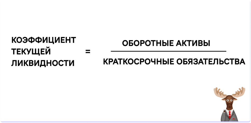 В этой формуле оборотные активы — это деньги, запасы и дебиторка, а краткосрочные обязательства — долги компании, которые вот-вот нужно будет возвращать.
