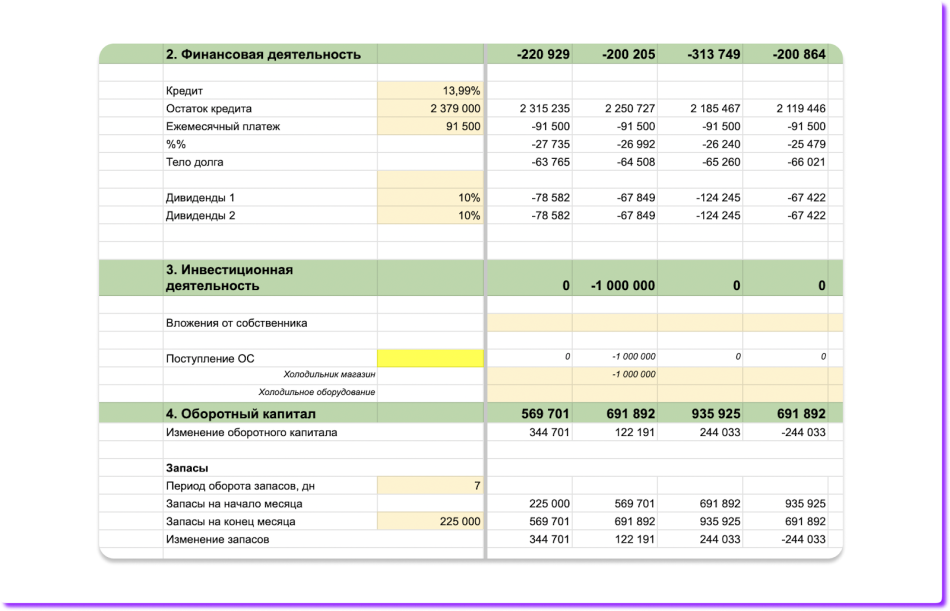 - Финансовая деятельность — затраты и поступления в ходе финансовой деятельности: получение или выдача займов и кредитов, выплаты дивидендов, вложения собственника. Что касается кредита, то в этом блоке финмодель рассчитывает платежи именно по телу долга. В нашем случае мы добавили ежемесячный платеж по кредиту и выплату дивидендов собственнику.